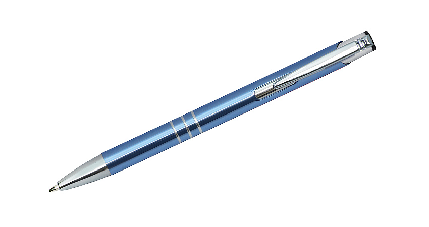 Metalowy długopis o metalizowanej chromowanej powierzchni. Długopis automatyczny z 3 ringami i niebieskim wkładem. Logo grawerujemy na powierzchni długopisu.