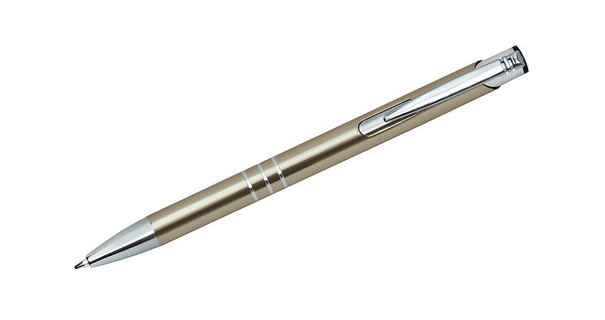 Metalowy długopis KALIPSO o metalizowanej chromowanej powierzchni. Długopis automatyczny z 3 ringami i niebieskim wkładem. Logo grawerujemy na powierzchni długopisu.