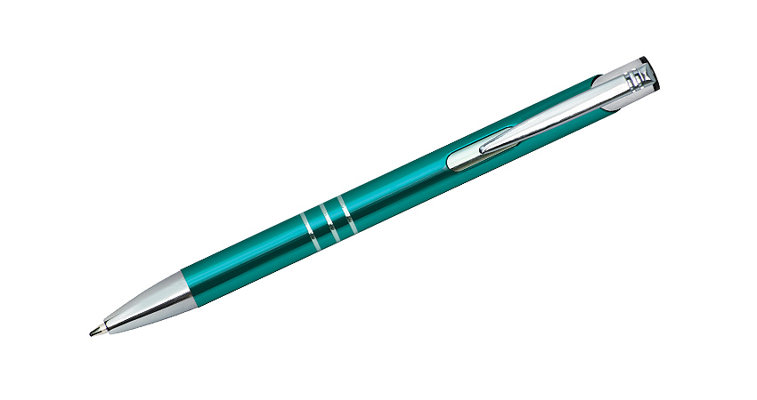 Metalowy długopis KALIPSO o metalizowanej chromowanej powierzchni. Długopis automatyczny z 3 ringami i niebieskim wkładem. Logo grawerujemy na powierzchni długopisu.