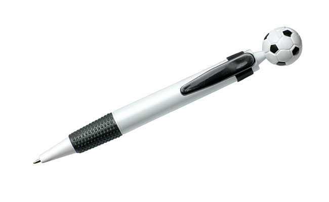 Długopis z tworzywa sztucznego z pstryczkiem w kształcie piłki nożnej, niebieski wkład.