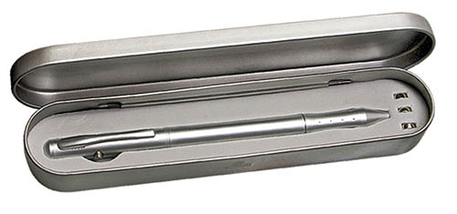 Wskaźnik laserowy z długopisem i pałeczką dotykową, pakowany w metalowe etui. Logo grawerujemy na wskaźniku lub na etui. Długopis z czarnym wkładem.