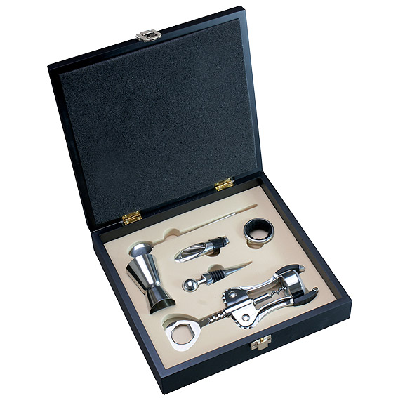 Bogato wyposażony ekskluzywny komplet do wina, który pełni jednocześnie funkcję zestawu barmańskiego. Komplet, który zawiera prosty w obsłudze korkociąg, zatyczkę, nalewak, opaskę na szyjkę butelki, kieliszek-miarka i mieszadełko, zapakowany jest w czarną drewnianą skrzyneczkę. Logo grawerujemy bezpośrednio na pudełku albo na blaszce, którą przyklejamy do pudełka.